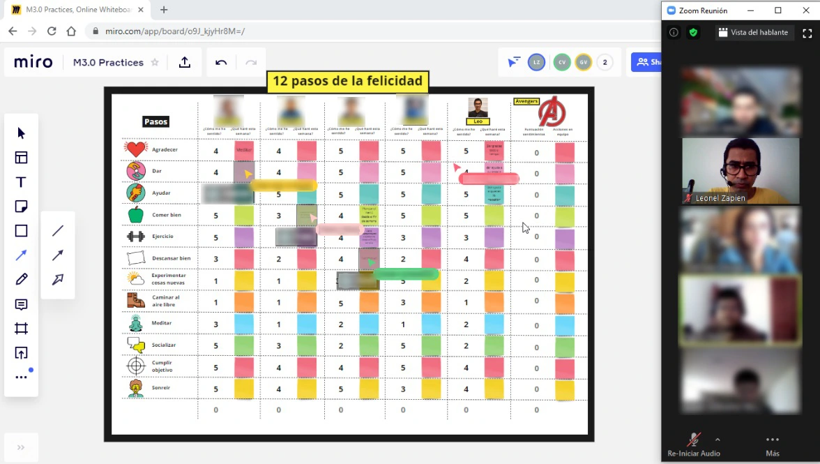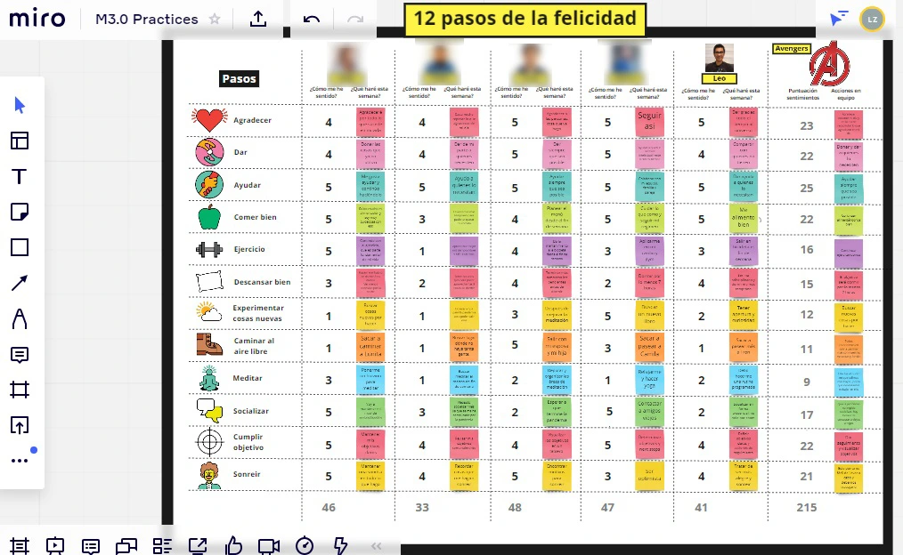 El objetivo de la práctica es reflexionar sobre la felicidad, revisar cómo se siente cada integrante del equipo en cada uno de los 12 pasos. Además, identificar qué puede hacer cada integrante en cada uno de los 12 pasos para mejorar el nivel en el que se siente.