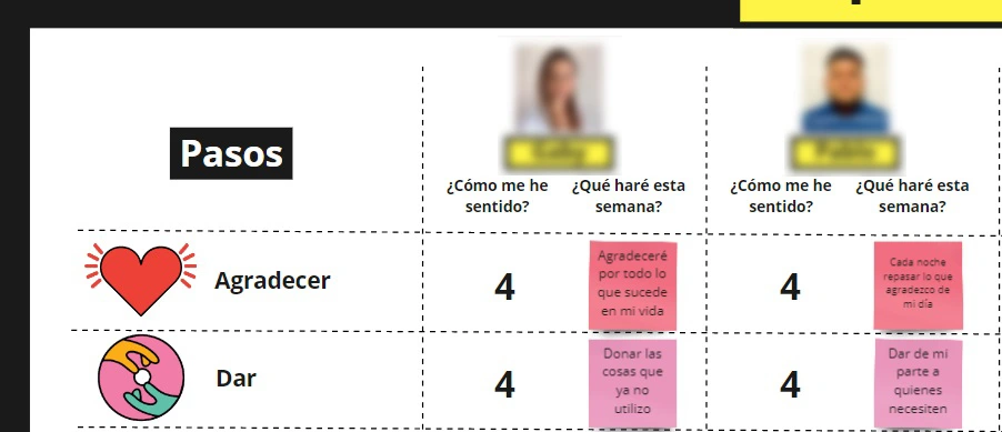 Por ejemplo: Para tratar de incrementar el paso “Dar” de “4” a “5”, el integrante escribió: “Donar las cosas que ya no necesito”.