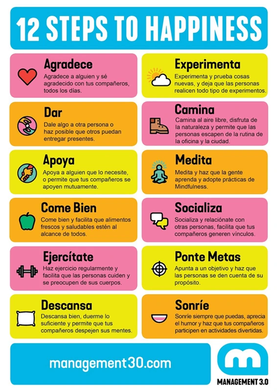 Puedes descargar esta plantilla de los 12 Pasos de la Felicidad del sitio oficial de Management 3.0 aquí.