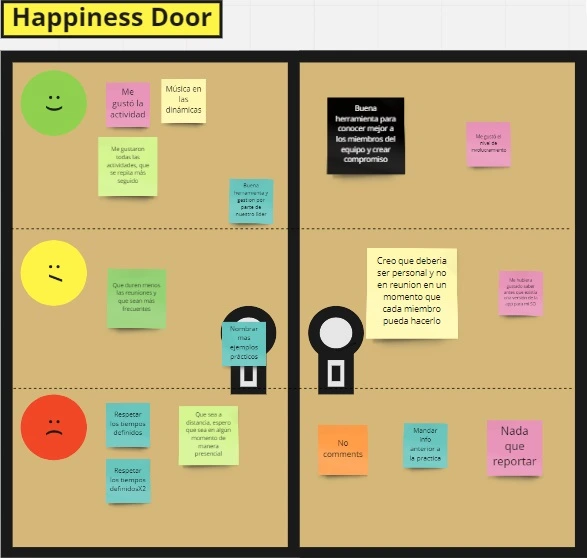 En el tablero inicial en miro, se dividió una puerta en 3 secciones, una para cada uno de los emojis, para que los integrantes del equipo pusieran sus notas en cada sección según como se sintieran.