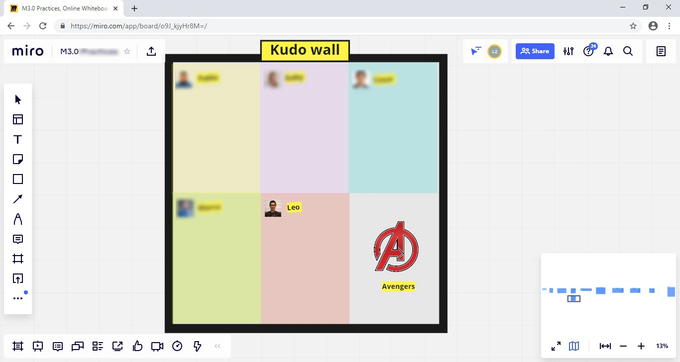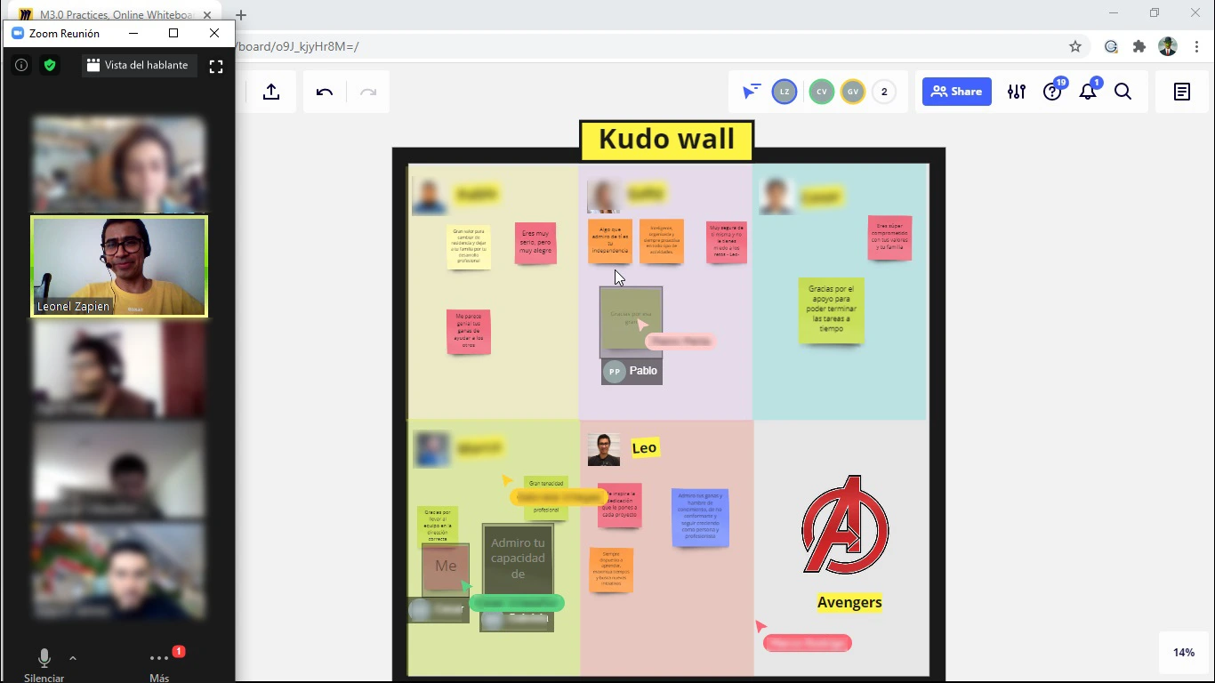 Para facilitar la práctica, se creó un tablero colaborativo en miro a manera de una pared de kudos (Kudo wall), dado que el equipo trabaja de manera distribuida: