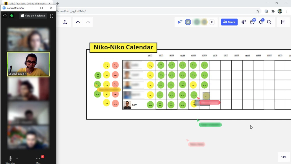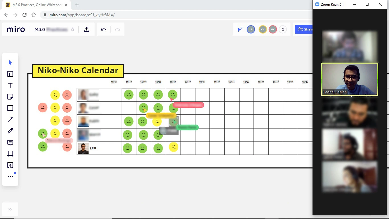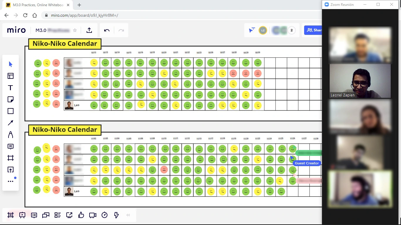 Mi recomendación es que pruebes en tu equipo qué momento del día se sienten mejor de llenar el calendario, si al inicio o al final de la jornada. Así mismo, si tienen agendas complicadas pueden no esperar a estar reunidos todos a la misma hora, sino que cada integrante puede llenar individualmente su casilla en el calendario cuando le sea más sencillo, aunque en nuestro caso el hacerlos todos al mismo tiempo permitió dedicar un par de minutos a platicar cómo nos sentimos, lo cual fue enriquecedor. Espero que esta experiencia que he compartido les resulte de interés y los invito ampliamente a que apliquen Niko-Niko calendar en su equipo, los resultados que obtendrán serán bastante felices.